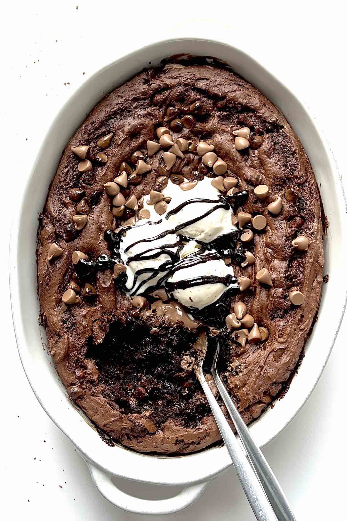 Step 3 - Bake: Bake on the middle rack for 30-35 minutes, or until a toothpick comes out clean. Serve warm with a scoop of vanilla ice cream, whipped cream, and or chocolate syrup.